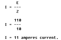 | If an ac circuit consists of resistance only, the value of the impedance is the same as the resistance, and Ohm's law for an ac circuit, I = E/Z, is exactly the same as for a dc circuit. In figure 8-188 a series circuit containing a lamp with 11 ohms resistance connected across a source is illustrated. To find how much current will flow if 110 volts dc are applied and how much current will flow if 110 volts ac are applied, the following examples are solved: | ![]() |
