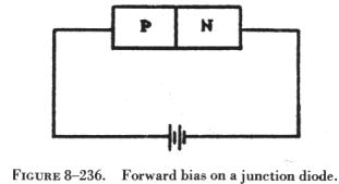 | In figure 8-236, the positive terminal of the battery is connected to the P-type semiconductor material, and the negative terminal is connected to the N-type. This arrangement constitutes forward bias. The holes in the P-type material are repelled from the positive terminal and move toward the junction. The electrons in the N-type material are repelled from the negative terminal and likewise move toward the junction. This decreases the space charge existing at the junction, and electron current flow is maintained through the external circuit. The current in the P-type material is in the form of holes, and in the N-type material it is in the form of electrons. If the forward bias is increased, current flow will increase. If the forward bias is increased excessively, it will cause excessive current. The excessive current will increase thermal agitation and the crystal structure will break down. One important fact worth remembering is that all solid state devices are sensitive to heat and will be destroyed if the heat becomes too intense. |