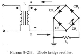 An advantageous modification of the fullwave diode rectifier is the bridge rectifier. The bridge rectifier differs from the fullwave rectifier in that a bridge rectifier does not require a center tapped transformer, but does require two additional diodes.