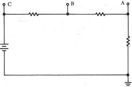 When the current reaches tap B, 30 more volts have been used to move the electrons through R2, and in a similar manner the remaining 50 volts are used for R3. But the voltages across R2 and R3 are positive voltages, since they are above ground potential. Figure 8-76 shows the voltage divider used previously. The voltage drops across the resistances are the same; however, the reference point (ground) has been changed. The voltage between ground and tap A is now a negative 100 volts, or the applied voltage. The voltage between ground and tap B is a negative 80 volts, and the voltage between ground and tap C is a negative 50 volts. |