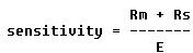 The sensitivity of a voltmeter is given in ohms per volt (ohms/E) and is determined by dividing the resistance (Rm) of the meter plus the series resistance (Rs) by the full scale reading in volts. Thus,
