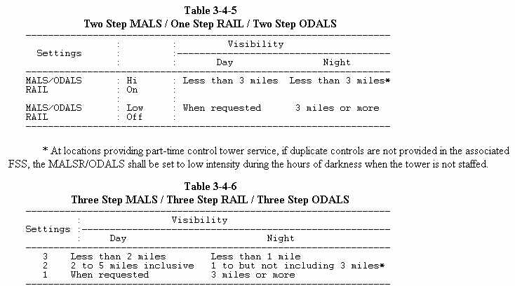 Operate MALSR/ODALS that have separate on-off and intensity setting controls in accordance with TBL 3-4-5 and TBL 3-4-6 except: