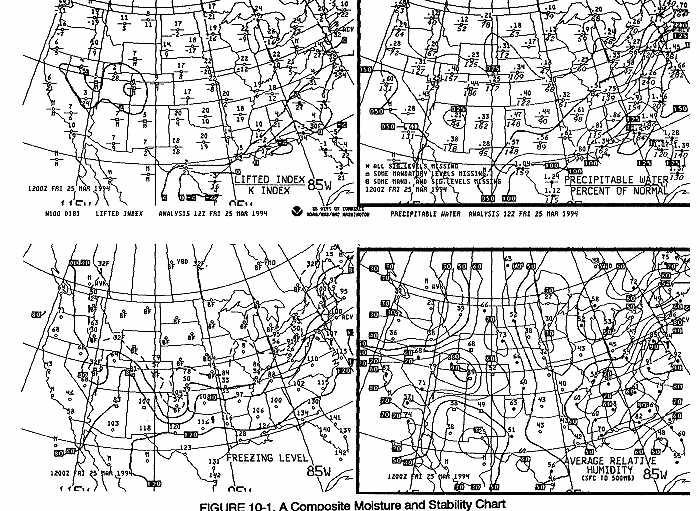 The composite moisture stability chart (Figure 10-1), is an analysis chart using observed upper air data. The chart is composed of four panels including stability, freezing level, precipitable water and, average relative humidity. This computer-generated chart is available twice daily with valid times of 12Z and 00Z. The availability of upper air data (on all the panels) for analysis is indicated by the shape of the station model. Use the legend on the precipitable water panel of Figure 10-4 for the explanation. On this chart, the mandatory levels used are the surface, the 1000 mb/hPa, the 850 mb/hPa, the 700 mb/hPa, and the 500 mb/hPa. Significant levels are the levels where significant changes in temperature and/or moisture occur when compared to below or above that level.