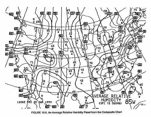 The average relative humidity panel, the lower right panel of the chart, is an analysis of the average relative humidity from the surface to 500 mb/hPa. The values are plotted as a percentage for each reporting station (Figure 10-5). An "M" indicates the value is missing.
