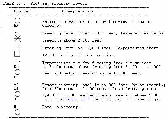 Plotted multiple crossings of the zero degree Celsius isotherm always show an inversion with warm air above subfreezing temperatures (Table 10-3). This situation can produce very hazardous icing when precipitation is occurring. Airmet ZULU (Section 4) shows more specifically the areas of expected icing. The low-level significant weather prog shows anticipated changes in the freezing level.