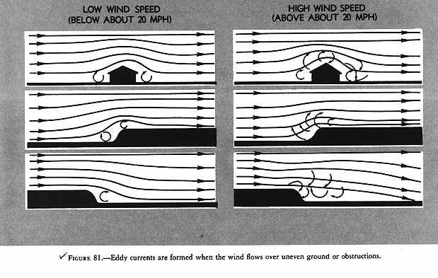 When the wind blows over large obstructions such as mountain ridges, a condition is set up similar to that depicted in the upper right portion of figure 81; however, it is a much more disturbed condition. The wind blowing up the slope on the windward side is usually relatively smooth. However, on the leeward side the wind spills rapidly down the slope, similar to the way water flows down a rough streambed, setting up strong downdrafts and causing the air to be very turbulent (fig. 67). The downdrafts can be very violent and may cause aircraft to strike the sides of the mountains. Therefore, when approaching mountain ridges against the wind, it is sound practice to make an extra altitude allowance to assure safe terrain clearance. Where pronounced mountain ridges and strong winds are present, a clearance of 2,000 or 3,000 feet above the terrain is considered a desirable minimum. Also, it is advisable to climb to the crossing altitude well before reaching the mountains to avoid having to make the climb in a persistent downdraft.