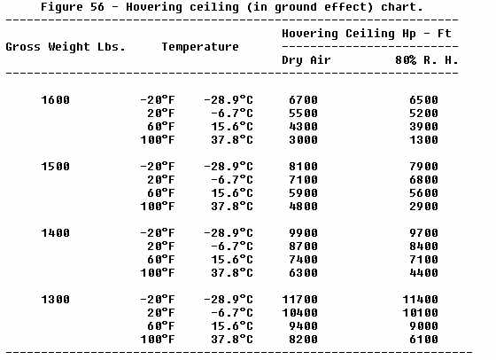 1. An increase in temperature decreases the hovering ceiling - For example, at 1,600 pounds gross weight in dry air, as the temperature increases from -20° F. to 100° F., the hovering ceiling decreases from 6,500 feet to 1,300 feet.