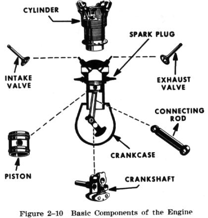 The propeller, which uses the engine power to produce thrust, is discussed later in this chapter as a separate unit or accessory. The basic parts of a reciprocating engine are the crankcase, cylinders, pistons, connecting rods, valves, spark plugs, and crankshaft (Fig. 2-10). In the head or top of each cylinder are two valves and two spark plugs. One of these valves opens and closes a passage leading from the carburetor (or induction manifold) and is called the intake valve. The other opens and closes a passage leading to the outside atmosphere (or exhaust manifold) and is called the exhaust valve. Inside each cylinder is a movable piston which is attached to a crankshaft by means of a connecting rod. When the rapidly expanding gases (resulting from the heat of combustion of the fuel ignited by spark plugs) push the piston down within the cylinder, it causes the crankshaft to rotate. At the same time, pistons in the other cylinders and attached to the same crankshaft are moved within their individual cylinders by the rotation of the crankshaft and go through the exact same sequence or cycle. |