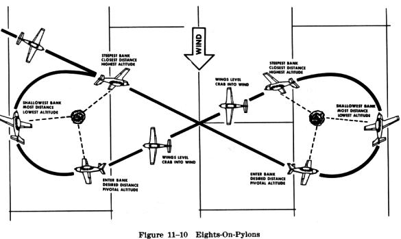 Before beginning the maneuver, select two points on the ground along a line which lies 90 degrees to the direction of the wind. The area in which the maneuver is to be performed should be checked for obstructions and any other air traffic, and it should be located where a disturbance to groups of people, livestock, or communities will not result. The selection of proper pylons is of importance to good eight on pylons. They should be sufficiently prominent to be readily seen by the pilot when completing the turn around one pylon and heading for the next, and should be adequately spaced to provide time for planning the turns and yet not cause unnecessary straight and level flight between the pylons. Approximately 3 to 5 seconds of straight and level flight should be sufficient for checking the area properly before entering the next turn. |