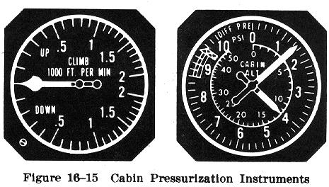 Several instruments are used in conjunction with the pressurization controller. The cabin differential pressure gauge indicates the difference between inside and outside pressure. This gauge should be monitored to assure that the cabin does not exceed the maximum allowable differential pressure. A cabin altimeter is also provided as a check on the performance of the system. In some cases, these two instruments are combined into one. A third instrument indicates the cabin rate of climb or descent. A cabin rate of climb instrument and a cabin altimeter are illustrated in Fig. 16-15.