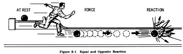 The English philosopher and mathematician Sir Isaac Newton is credited with having observed in 1687 that "for every action there is an equal and opposite reaction" (Fig. 3-1). This principle applies whenever two things act upon each other, such as the air and the propeller, or the air and the wing of an airplane. In short, the statement about "action and reaction" tells us how lift and propulsion of airplanes are produced.