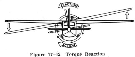 Torque reaction involves Newton's Third Law of Physics - for every action, there is an equal and opposite reaction. As applied to the airplane, this means that as the internal engine parts and propeller are revolving in one direction, an equal force is trying to rotate the airplane in the opposite direction (Fig. 17-42).