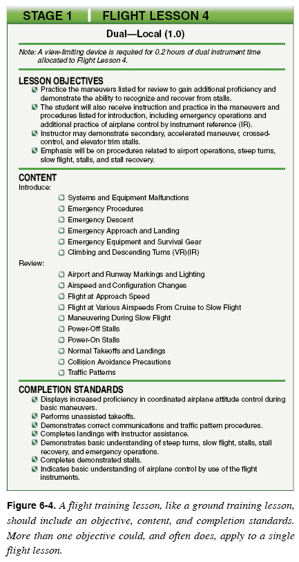 The flight training syllabus should include special emphasis items that have been determined to be cause factors in aircraft accidents or incidents. For example, the instructor should emphasize collision and wake turbulence avoidance procedures throughout a student’s flight training. The aviation technician syllabus should also emphasize what constitutes unsafe practices, such the ease of introducing foreign object damage (FOD) to an aircraft when the location of tools is not monitored. A syllabus may include several other items that add to or clarify the objective, content, or standards. A lesson may specify the recommended class time, reference or study materials, recommended sequence of training, and study assignment for the next lesson. Both ground and flight lessons may have explanatory information notes added to specific lessons. [Figure 6-5]