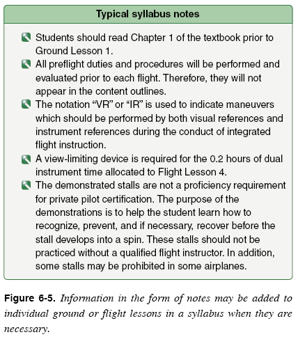 How To Use a Training Syllabus Any practical training syllabus must be flexible and should be used primarily as a guide. [Figure 6-3] When necessary, the order of training can and should be altered to suit the progress of the student and the demands of special circumstances. For example, previous experience or different rates of learning often require some alteration or repetition to fit individual students. The syllabus should also be flexible enough so it can be adapted to weather variations, aircraft availability, and scheduling changes without disrupting the teaching process or completely suspending training.