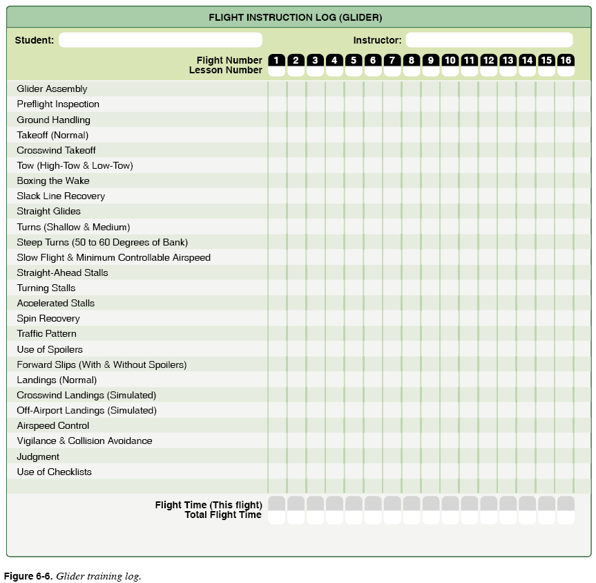 While a syllabus is designed to provide a road map showing how to accomplish the overall objective of a course of training, it may be useful for other purposes. As already mentioned, it can be used as a checklist to ensure that required training has successfully been completed. Thus, a syllabus can be an effective tool for recordkeeping. Enhanced syllabi, which also are designed for recordkeeping, can be very beneficial to the independent instructor. This recordkeeping function is usually facilitated by boxes or blank spaces adjacent to the knowledge areas, procedures, or maneuvers in a lesson. Most syllabi introduce each procedure or maneuver in one lesson and review them in subsequent lessons. Some syllabi also include provisions for grading student performance and recording both ground and flight training time. Accurate recordkeeping is necessary to keep both the student and the instructor informed on the status of training. These records also serve as a basis for endorsements and recommendations for knowledge and practical tests. Some training syllabi or records may include coded numbers or letters for other instructors to record their evaluation of a student’s progress and knowledge or skill level. [Figure 6-6]