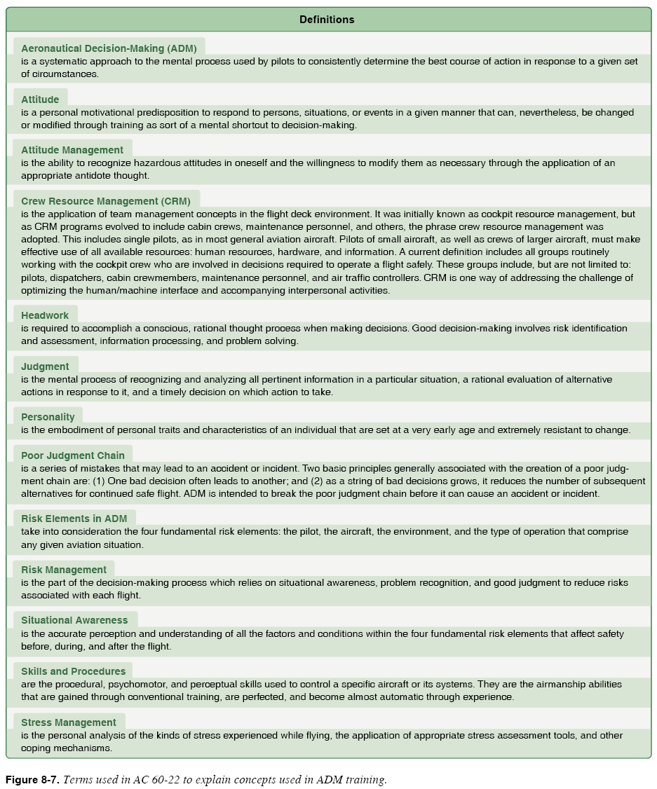 Aeronautical Decision-Making As discussed on page 8-2, aviation training and flight operations are now seen as a system rather than individual concepts. The goal of system safety is for pilots to utilize all four concepts (ADM, risk management, situational awareness, and SRM) so that risk can be reduced to the lowest possible level. ADM is a systematic approach to the mental process used by aircraft pilots to consistently determine the best course of action in response to a given set of circumstances. Risk management is a decision-making process designed to systematically identify hazards, assess the degree of risk, and determine the best course of action associated with each flight. Situational awareness is the accurate perception and understanding of all the factors and conditions within the four fundamental risk elements that affect safety before, during, and after the flight. SRM is the art and science of managing all resources (both onboard the aircraft and from outside sources) available to a single pilot (prior and during flight) to ensure the successful outcome of the flight. These key principles are often collectively called ADM. The importance of teaching students effective ADM skills can not be overemphasized. While progress is continually being made in the advancement of pilot training methods, aircraft equipment and systems, and services for pilots, accidents still occur. Despite all the changes in technology to improve flight safety, one factor remains the same—the human factor. It is estimated that approximately 80 percent of all aviation accidents are human factors related. By taking a system approach to aviation safety, flight instructors interweave aeronautical knowledge, aircraft control skills, ADM, risk management, situational awareness, and SRM into the training process. Historically, the term “pilot error” has been used to describe the causes of these accidents. Pilot error means that an action or decision made by the pilot was the cause of, or contributing factor to, the accident. This definition also includes the pilot’s failure to make a decision or take action. From a broader perspective, the phrase “human factors related” more aptly describes these accidents since it is usually not a single decision that leads to an accident, but a chain of events triggered by a number of factors. The poor judgment chain, or the error chain, describes this concept of contributing factors in a human factors related accident. Breaking one link in the chain is all that is usually necessary to change the outcome of the sequence of events. The best way to illustrate this concept to students is to discuss specific situations that lead to aircraft accidents or incidents. The following is an example of the type of scenario that can be presented to illustrate the poor judgment chain. A private pilot with 100 hours of flight time made a precautionary landing on a narrow dirt runway at a private airport. The pilot lost directional control during landing and swerved off the runway into the grass. A witness recalled later that the aircraft appeared to be too high and fast on final approach, and speculated the pilot was having difficulty controlling the aircraft in high winds. The weather at the time of the incident was reported as marginal VFR due to rain showers and thunderstorms. When the aircraft was fueled the following morning, 60 gallons of fuel were required to fill the 62-gallon capacity tanks. By discussing the events that led to this incident, instructors can help students understand how a series of judgmental errors contributed to the final outcome of this flight.