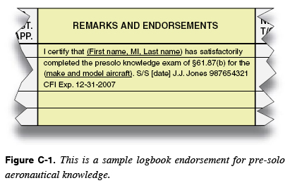 Appendix C Certificates, Ratings, and Endorsements Flight Instructor Endorsements The authority and responsibility for flight instructors to endorse initial student certificates, logbooks for solo and solo cross-country, additional aircraft ratings, and flight privileges are outlined in Title 14 of the Code of Federal Regulations (14 CFR) part 61. In addition, Advisory Circular (AC) 61-65, Certification: Pilots and Flight Instructors and Ground Instructors, provides guidance for pilots, flight instructors, ground instructors, and examiners on the certification standards, knowledge test procedures, and other requirements of 14 CFR part 61. By utilizing AC 61-65, the flight instructor does not omit any required endorsement for the rating sought, which ensures standardization. It is important for the flight instructor to understand and use AC 61-65 in the certification process. Additionally, flight instructors are required to make an endorsement in the student or applicant’s logbook or training record whenever the flight instructor provides flight or ground training. At a minimum this endorsement should include what actions or instruction were completed and if any regulatory requirements were met. Citing the appropriate portion of 14 CFR part 61 is also recommended. Flight instructors also have the responsibility to make logbook endorsements for pilots who are already certificated such as sport, recreational, private, commercial, and instrument rated pilots, as well as flight instructors. Typical endorsements include but are not limited to flight reviews, instrument proficiency checks, the additional training required for high performance, high altitude, and tail wheel aircraft, and types of glider launches. Additional rating applicants (e.g., multiengine add-on, seaplane add-on, glider add-on, helicopter add-on) are rated pilots and not considered student pilots in accordance with (IAW) 14 CFR part 61. Flight instructors must endorse the applicant’s logbook prior to solo flight and prior to being evaluated for that rating with an endorsement from AC 61-65 stating that the applicant is competent to act as the pilot in command (PIC) of an aircraft in which he or she does not hold a category or class rating. The flight instructor may add additional requirements or restrictions to the endorsement, such as an expiration date. Practical test endorsements are addressed in AC 61-65. These endorsements are regulatory and the pilot applicant must comply with them.