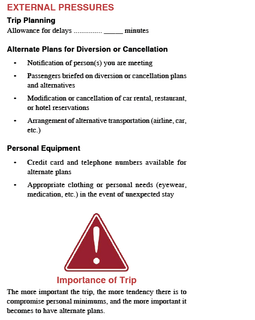 Each item provides you with either a space to complete a personal minimum or a checklist item to think about. Spend some quiet time completing each blank and consider other items that apply to your personal minimums. Give yourself permission to choose higher minimums than those specified in the regulations, aircraft flight manuals, or other rules. How To Use Your Checklist Use this checklist just as you would use one for your aircraft. Carry the checklist in your flight kit. Use it at home as you start planning a flight and again just before you make your final decision to fly. Be wary if you have an item that’s marginal in any single risk factor category. But if you have items in more than one category, you may be headed for trouble. If you have marginal items in two or more risk factors/categories, do not go! Periodically review and revise your checklist as your personal circumstances change, such as your proficiency, recency, or training. You should never make your minimums less restrictive unless a significant positive event has occurred. However, it is okay to make your minimums more restrictive at any time. And never make your minimums less restrictive when you are planning a specific flight, or else external pressures will influence you. Have a fun and safe flight! PILOTExperience/Recency Takeoffs/landings..................... _____ in the last _____ days Hours in make/model ................ _____ in the last _____ days Instrument approaches ............ _____ (simulated or actual) in the last _____ days Instrument flight hours ............._____ (simulated or actual) in the last _____ days Terrain and airspace ................. familiar Physical Condition