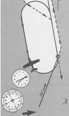 Figure 8-31 illustrates a standard holding pattern (dotted line shows holding entry), as well as the procedure turn for approach to the airport. Holding may or may not be necessary, depending upon traffic and weather conditions. If you hold as illustrated, your entry would be as specified in the Airman's Information Manual. The appropriate communications procedures are explained in a later chapter of this text. Assuming a 10° left drift correction angle as you track inbound on the 020° magnetic bearing, proceed as follows:
