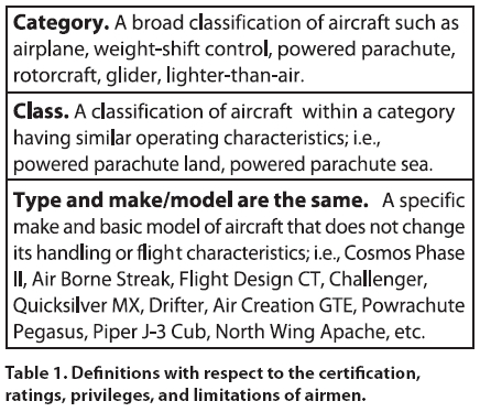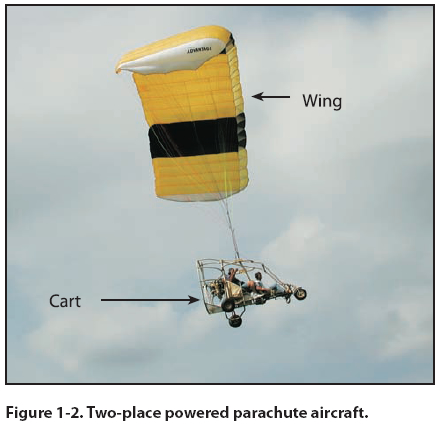 Chapter 1 - Introduction to the Powered Parachute Powered Parachute Terms Different terms have been used throughout the powered parachute community. [Figure 1-2] The terms standardized throughout this book are as follows: • Powered Parachute – The complete aircraft. • Cart – The engine and seats, attached by a structure to wheels; may also be referred to as the fuselage, cockpit, chaise, or airframe. • Wing – Typically a ram-air inflated and pressurized wing including lines that attach to the cart. The wing is not in position to fly until the aircraft is in motion; when not inflated, referred to as a parachute or chute. Introduction to the Powered Parachute The powered parachute is a category of aircraft that flies in a manner unique among light-sport aircraft. Three significant differences separate the PPC from other types of light sport aircraft (LSA): [Figure 1-3] 1. The wing must be inflated and pressurized by ram air prior to each takeoff. 2. The aircraft uses a pendulum configuration, where the cart hangs about 20 feet below the wing, connected via flexible suspension lines. 3. The wing is at a relatively fixed angle with the suspension lines and flies at a relatively constant speed. Other aircraft categories allow pilots to change the speed of the aircraft, but the powered parachute airspeed remains within a very small range. A powered parachute can be a single place ultralight flying vehicle, a single place light-sport aircraft, or a multi-place light-sport aircraft. The common acronyms for this vehicle/aircraft are PPC (powered parachute), PPCL (powered parachute land) or PPCS (powered parachute sea). A light-sport aircraft PPC used for sport and private flying must be registered with an FAA N-number, have an airworthiness certificate, a pilot’s operating handbook (POH), and/or limitations with a weight and balance document aboard. The aircraft must be maintained properly by the aircraft owner or other qualified personnel and have the aircraft logbooks available for inspection. Dual controls are required in the aircraft for training. Powered Parachute Pilot Certificate Eligibility Requirements You may not act as pilot in command (PIC) of a lightsport aircraft powered parachute unless you hold a pilot certificate with a powered parachute rating issued by the FAA. At this time the only pilot certificates with powered parachute ratings are Student, Sport and Private. The FAA is empowered by the U.S. Congress to promote aviation safety by prescribing safety standards for pilots and the other civil aviation programs. The Code of Federal Regulations (CFRs), formerly referred to as Federal Aviation Regulations (FARs), are one of the primary means of conveying these safety standards. Title 14 CFR, part 61 specifies the requirements to earn a pilot certificate. This regulation also states the pilot applicant must be able to read, speak, write, and understand the English language. The FAA Practical Test Standards (PTS) establish the standards for the knowledge and skills necessary for the issuance of a pilot certificate. [Figure 1-4] You should reference both these documents to understand the knowledge, skills and experience required to obtain a pilot certificate to fly a powered parachute. Pilot applicants must have a valid U.S. driver’s license or a current third-class medical certificate issued under 14 CFR part 67. If you use your valid driver’s license to exercise the privileges of a Sport Pilot certificate, then you must also adhere to any restrictions on that driver’s license. You must hold a current thirdclass medical certificate to exercise the privileges of a Private Pilot certificate. The process of learning to fly includes a combination of ground training (to include successful completion of the FAA Knowledge Exam) and flight training to include dual flights with a certified flight instructor (CFI), as well as solo flights under the supervision of your CFI. To be eligible to fly solo in a PPC, you must be at least 16 years of age and demonstrate satisfactory aeronautical knowledge on a test developed by your instructor. You must have received and logged flight training for the maneuvers and procedures in 14 CFR part 61 for the PPC, as well as demonstrated satisfactory proficiency and safety. Only after all of these requirements are met can your instructor endorse your student pilot certificate and logbook for solo flight. Once you obtain the required aeronautical knowledge and experience required by 14 CFR part 61, your flight instructor will endorse you to take a practical test (often called a “checkride”) with a sport pilot examiner (SPE) or an FAA inspector. After you’ve demonstrated satisfactory aeronautical knowledge and skill in the Areas of Operation and Tasks outlined in the PTS, this examiner or inspector will issue your temporary (paper) pilot certificate. You will receive a plastic certificate in the mail once the results of the practical test are received by the FAA Registration branch. A sport pilot is certified to fly a light-sport aircraft. To be eligible for a sport pilot certificate with a powered parachute rating, you must be at least 17 years of age, complete the specific training and flight time requirements described in 14 CFR part 61 subpart J, pass the FAA Knowledge Exam, and successfully complete the practical test. If you hold at least a private pilot certificate, but not a rating for the category and class of PPC LSA, you can operate the powered parachute with a logbook endorsement and passing a proficiency check. [Table 1] If you hold at least a private pilot certificate with a PPC category and class rating, and have a current third-class medical, then you may operate any PPC LSA in that category and class, and do not need to hold any of the endorsements required by Sport Pilots, nor do you need to comply with the limitations of a Sport Pilot certificate.