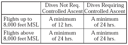 Chapter 1 - Introduction to the Powered Parachute Scuba Diving Taking a flight, especially a high flight, after a deep scuba dive can have some devastating results. This is because the increased pressure of the water during a dive causes nitrogen to be absorbed into the body tissues and bloodstream. Then, when flying at altitudes of reduced atmospheric pressure, the nitrogen will move out of the bloodstream and tissues at a rapid rate. This rapid out-gassing of nitrogen is called the bends (as it is felt in the joints—the bending joints of the limbs) and is painful and incapacitating. A pilot or passenger who intends to fly after scuba diving should allow the body sufficient time to rid itself of excess nitrogen that was absorbed during the dive. If the appropriate amount of time is not allowed, decompression sickness due to gases released in the blood can result in a serious in-flight emergency. As an absolute standard safety measure, any pilot flying near a large body of water should ask the passenger during the preflight if he or she has recently been scuba diving. The following waiting times are recommended: