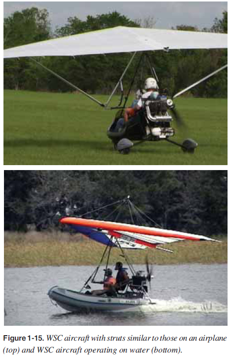 ![]() • Since the WSC aircraft is designed without the weight and drag of a tail, the performance is signifi cantly increased. The aircraft can take off and land in short fields, has good climb rates, can handle a large payload, has a good glide ratio, and is fuel effi cient. The WSC LSA typically can carry 600 pounds of people, fuel, and baggage. Besides having large and small wings for different speeds, the WSC aircraft wings can have wires for bracing, struts, or a combination of both. Throughout this handbook, both are used in diagrams and pictures. WSC aircraft are typically on wheels, but there are models that can land and take off on water and snow. [Figure 1-15] ![]() |