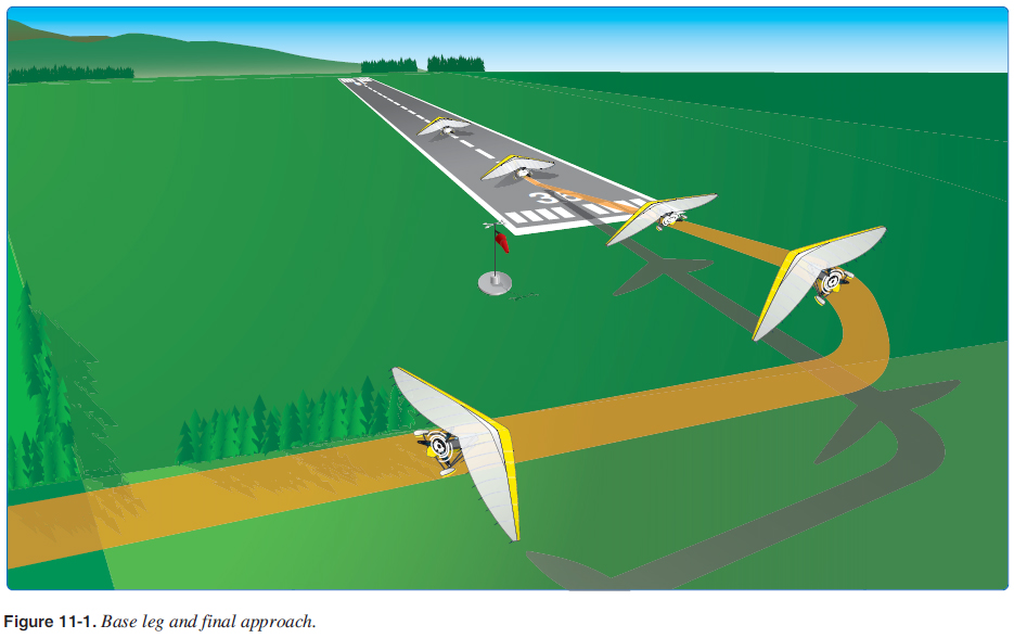 For landings where throttle is required, the foot throttle is typically used so the hands can stay on the control bar while approaching the ground for this critical phase of fl ight. However, the hand/cruise throttle may be set above idle for specifi c situations as required by the pilot. Higher power settings for approaches and landings are discussed later in this chapter. Base Leg The placement of the base leg is one of the more important judgments made by the pilot in any landing approach. [Figure 11-1] The pilot must accurately judge the altitude and distance from which the descent results in landing at the desired point.