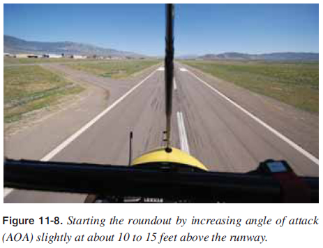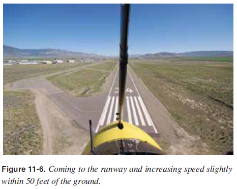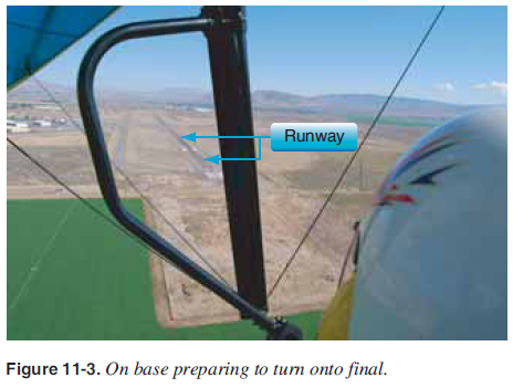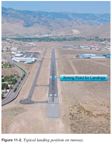 The base leg should be started at a point where the power can be brought back to idle and the WSC aircraft can glide to the landing spot at the approach speed recommended by the manufacturer. The intended landing point should not be at the end of the runway on a threshold or numbers, but beyond at the landing lines. [Figure 11-2] This provides some margin if the landing is shorter than anticipated. For smaller runways that do not have these markings, establish an appropriate landing point beyond the start of the runway, allowing plenty of room for the after-landing roll. At much larger airports, the landing can be done farther down the runway or at a location where the pilot can taxi off the runway and not delay other air traffi c behind the aircraft.