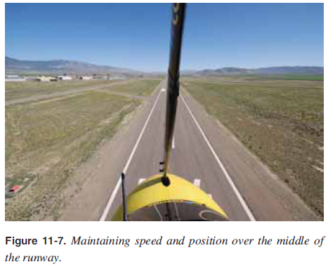 In a descent for fi nal approach, if the WSC is slowed with an angle of attack that is too high and without an increase of power, the aircraft settles very rapidly and touches down short of the desired area. For this reason, the pilot should never try to stretch a glide by applying forward control bar pressure alone to reach the desired landing area. Because this brings the speed below the minimum drag speed, the gliding distance decreases if power is not added simultaneously. Additionally, this is a lower energy approach and may be slower than the manufacturer’s safe approach speed. The proper angle of descent to the runway must be maintained at the minimum speed recommended by the manufacturer, with a fl atter descent angle obtained with increases in power as required. Steeper descent angles are obtained with headwinds or the pilot increasing speed/decreasing the angle of attack, both of which are covered later in this chapter. |