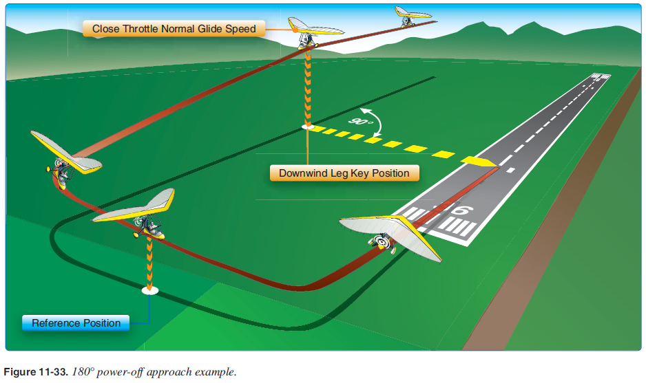 180° Power-Off Approach The 180° power-off approach is executed by gliding with the power off from a given point on a downwind leg to a preselected landing spot. [Figure 11-33] It is an extension of the principles involved in the 90° power-off approach just described. Its objective is to further develop judgment in estimating distances and glide ratios, in that the aircraft is fl own without power from a higher altitude and through a 90° turn to reach the base-leg position at a proper altitude for executing the 90° approach.