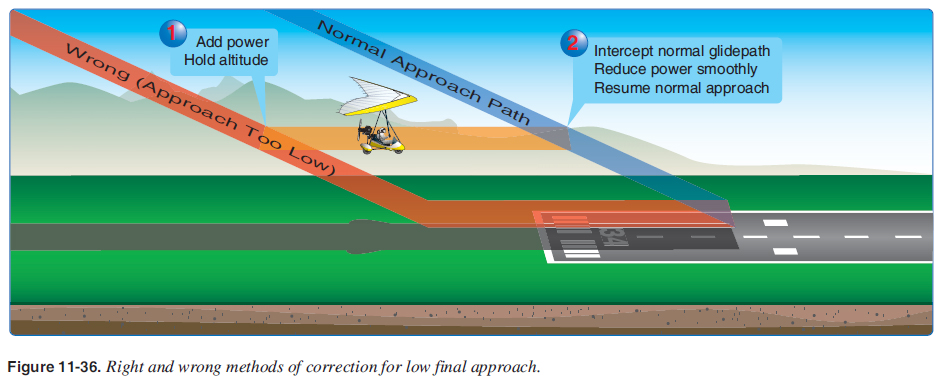 Faulty Approaches and Landings Low Final Approach When the base leg is too low, insuffi cient power is used, or the velocity of the wind is misjudged, suffi cient altitude may be lost, which causes the aircraft to be well below the proper fi nal approach path. In such a situation, the pilot would need to apply considerable power to maintain or gain altitude as required to fl y the aircraft (at an excessively low altitude) up to the runway threshold. When the proper approach path has been intercepted, the correct approach attitude should be reestablished, the power reduced, and a stabilized approach maintained. [Figure 11-36] Do not increase the pitch attitude without increasing the power since the aircraft decelerates rapidly and may approach the critical AOA and stall. If there is any doubt about the approach being safely completed, it is advisable to execute an immediate go-around.