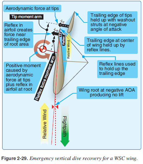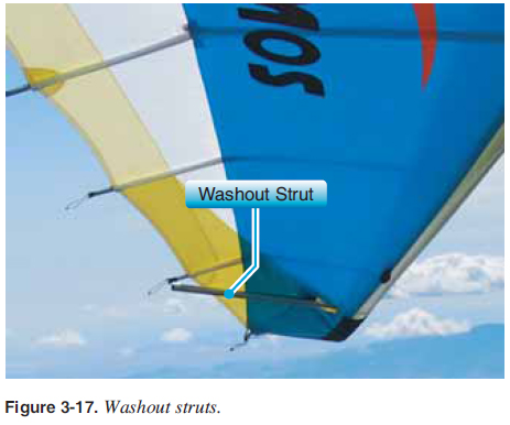 Wing Systems Refl ex Systems As discussed in the aerodynamics section, the trailing edge near the root and the tips must stay up during unusually low or negative angles of attack [Figure 2-29] to maintain a positive pitch stability for the aircraft. There are a number of refl ex systems used to accomplish this in emergency situations. ![]() Refl ex cables—most wings with a king post use cables to hold the trailing edge up at unusually low or negative angles of attack. These refl ex cables are secured to the top of the king post and attach to several positions on the trailing edge where the battens are located. Different manufacturers have different positions where these are attached, depending on the design of the wing. Refl ex cables also provide additional refl ex at high speeds because the drag of the wires pulls up the trailing edge, creating more refl ex at these higher speeds. [Figure 3-16] ![]() Washout struts—tubes near the tips that keep the tip trailing edge up during very low or negative angles of attack. They can be inside or outside the double surface of a wing. The refl ex cables may not go to the wingtip, so washout struts are used to hold up the trailing edge at the tip at very low and negative angles of attack. [Figure 3-17] ![]() Sprogs—for wings using struts with no king post, sprogs are used to keep the inboard trailing edge up in place of the refl ex cables. A wire attached to the top of the leading edge holds the sprog up in place. [Figure 3-18] ![]() Pitch Control System The pitch control system is a simple hinge on the keel at the hang point that allows the pilot to push the control bar out and pull the control bar in to control pitch. This wing attachment is different for each manufacturer, but all designs have this hang point wing attachment so the control bar is always perpendicular to the longitudinal axis of the aircraft. This raising and lowering of the nose is the pitch control system for the WSC aircraft. [Figures 2-7 and 3-19] ![]() ![]() |