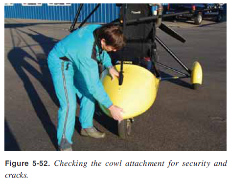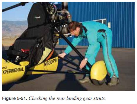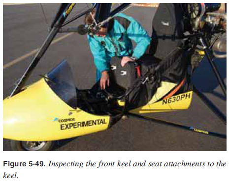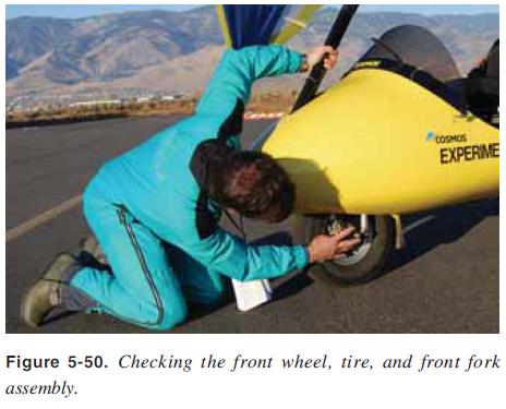 Carriage Inspection Inspect the mast from the top to the bottom and the carriage keel from the back to the front. [Figure 5-49] Check the front tube attachment and top and bottom security attachments. Check the seat security and seat attachments from the keel to the mast. ![]() Check the front nose wheel for proper play, tire infl ation, and secure axle bolt. Test the ground steering bar and ensure there is smooth steering range of motion. Check the front shocks, if installed, the brakes for rust and corrosion, loose nuts/bolts, alignment, cracks, signs of hydraulic fl uid leakage, and hydraulic line security and abrasion, if so equipped. [Figure 5-50] Check the foot throttle for smooth operation and assure the parking brake is secured. ![]() Inspect the main landing gear drag struts, attachment to the keel, and attachment to the rear wheels. Examine the rear tires for proper infl ation and tread plus the wheel attachment nut for security. Check main landing gear strut, landing gear shock absorber strut, and shock absorber operation. [Figure 5-51] Inspect all landing gear strut attachments to the airframe. Inspect the other side’s rear landing gear by repeating the above procedure in reverse. Check all cowling for secure attachment and cracks. [Figure 5-52] ![]() ![]() |