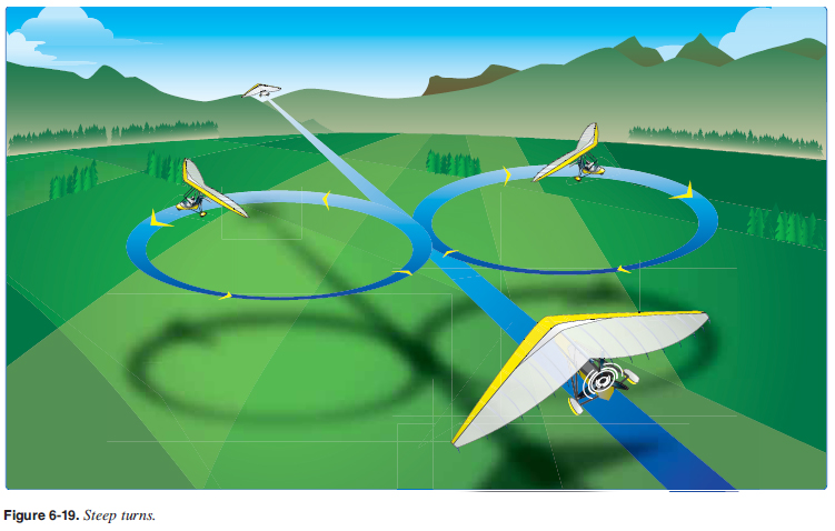 An aircraft’s maximum turning performance is its fastest rate of turn and its shortest radius of turn, which change with both airspeed and angle of bank. Each aircraft’s turning performance is limited by the amount of power its engine is developing, its limit load factor (structural strength), and its aerodynamic characteristics. Do not exceed the maximum bank angle limitation in the POH. For example, a maximum 60° bank angle is a limit used by many manufacturers. The pilot should realize the tremendous additional load that is imposed on an aircraft as the bank is increased beyond 45°. During a coordinated turn with a 60° bank, a load factor of approximately 2 Gs is placed on the aircraft’s structure. Regardless of the airspeed or the type of aircraft involved, a given angle of bank in a turn during which altitude is maintained always produces the same load factor. Pilots must be aware that an additional load factor increases the stalling speed at a signifi cant rate—stalling speed increases with the square root of the load factor. For example, a light aircraft that stalls at 40 knots in level fl ight stalls at nearly 57 knots in a 60° bank. The pilot’s understanding and observance of this fact is an indispensable safety precaution for the performance of all maneuvers requiring turns. Before starting the steep turn, the pilot should ensure that the area is clear of other air traffi c since the rate of turn is quite rapid. After establishing the manufacturer’s recommended entry speed or the design maneuvering speed, the aircraft should be smoothly rolled into a selected bank angle between 45° to 60° and the throttle increased to maintain level fl ight. Always perfect the steep turn at 45° and slowly work up to higher bank angles. As the turn is being established, control bar forward pressure should be smoothly increased to increase the angle of attack. This provides the additional wing lift required to compensate for the increasing load factor. After the selected bank angle has been reached, the pilot fi nds that considerable force is required on the control bar and increased throttle is required to hold the aircraft in level fl ight—to maintain altitude. Because of this increase in the force applied to the control bar, the load factor increases rapidly as the bank is increased. Additional control bar forward pressure increases the angle of attack, which results in an increase in drag. Consequently, power must be added to maintain the entry altitude and airspeed. During the turn, the pilot should not stare at any one object. Maintaining altitude, as well as orientation, requires an awareness of the relative position of the forward tube and the horizon. The pilot must also be looking for other aircraft mainly towards the direction of the turn while glancing at the instruments to make sure the airspeed and altitude are being maintained. If the altitude begins to increase or decrease a power adjustment may be necessary to maintain the altitude if the bank angle and speed are maintained. All bank angle changes should be done with coordinated use of pitch and throttle control. The rollout from the turn should be timed so that the wings reach level fl ight when the aircraft is exactly on the heading from which the maneuver was started. While the recovery is being made, forward bar pressure is gradually released and power reduced, as necessary, to maintain the altitude and airspeed. Common errors in the performance of steep turns are: