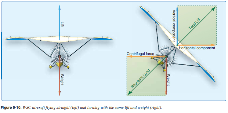 Changing the direction of the wing’s lift toward one side or the other causes the aircraft to be pulled in that direction. When an aircraft is flying straight and level, the total lift is acting perpendicular to the wings and to the Earth. [Figure 6-10] As the WSC is banked into a turn, the lift then becomes the resultant of two components. One, the vertical lift component, continues to act perpendicular to the Earth and opposes gravity. Second, the horizontal lift component (centripetal) acts parallel to the Earth’s surface and opposes inertia (apparent centrifugal force). These two lift components act at right angles to each other causing the resultant total lifting force to act perpendicular to the banked wing of the aircraft. It is the horizontal lift component that actually turns the WSC aircraft. [Figure 6-10]