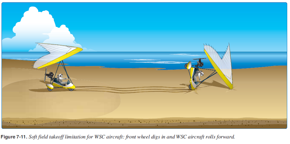 Soft/Rough Field Takeoff and Climb Takeoffs and climbs from soft fi elds require the use of operational techniques for getting the WSC aircraft airborne as quickly as possible to eliminate the drag caused by tall grass, soft sand, mud, and snow, and may or may not require climbing over an obstacle. The technique makes judicious use of ground effect and requires a feel for the WSC aircraft and fi ne control touch. These same techniques are also useful on a rough fi eld where it is advisable to get the aircraft off the ground as soon as possible to avoid damaging the landing gear. Soft surfaces or long, wet grass usually reduce the aircraft’s acceleration during the takeoff roll so much that adequate takeoff speed might not be attained if normal takeoff techniques were employed. It should be emphasized that the WSC aircraft is different from most aircraft. The high wing creates a high center of gravity in which the front wheel can bog down in soft fi elds and fl ip the WSC aircraft forward. The propeller in the back pushing down on the front wheel also contributes to this unique situation. This is a limitation for WSC aircraft that should not be ignored. WSC aircraft that land in soft fi elds or sand may not be able to take off. There is a wide variation of manufacturer designs with the least preferable being a skinny, high pressure, highly loaded front tire. WSC aircraft with large wide tires that can be operated at low pressure are designed for operation in soft and rough fi elds. [Figures 7-11 through 7-13]