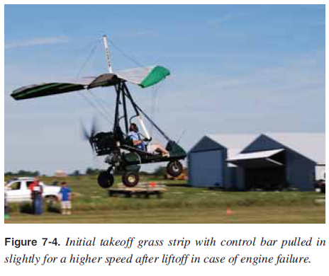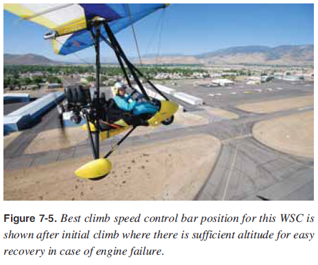 Initial Climb Upon lift-off, the WSC aircraft should be fl ying at the approximate pitch attitude that allows it to accelerate to at least the manufacturers takeoff safety speed. This is usually close to the best climb rate speed VY providing the greatest altitude gain in a period of time. Higher speeds should be used if the air is turbulent to assure the WSC does not stall from a strong wind gust. This speed should be maintained during the initial climb out in case of an engine failure. This is especially important with higher power engines and larger wings to avoid a high pitch attitude during this critical phase of the takeoff. With a lower pitch attitude and a faster speed, the WSC aircraft can recover easier from an engine failure on takeoff. This is discussed in greater detail in the emergency procedures chapter of this handbook. For example, from liftoff to 200 feet it is a good practice to keep a low pitch angle to anticipate an engine failure; above 200 feet, VY can be used as a climb speed. [Figures 7-4 and 7-5]