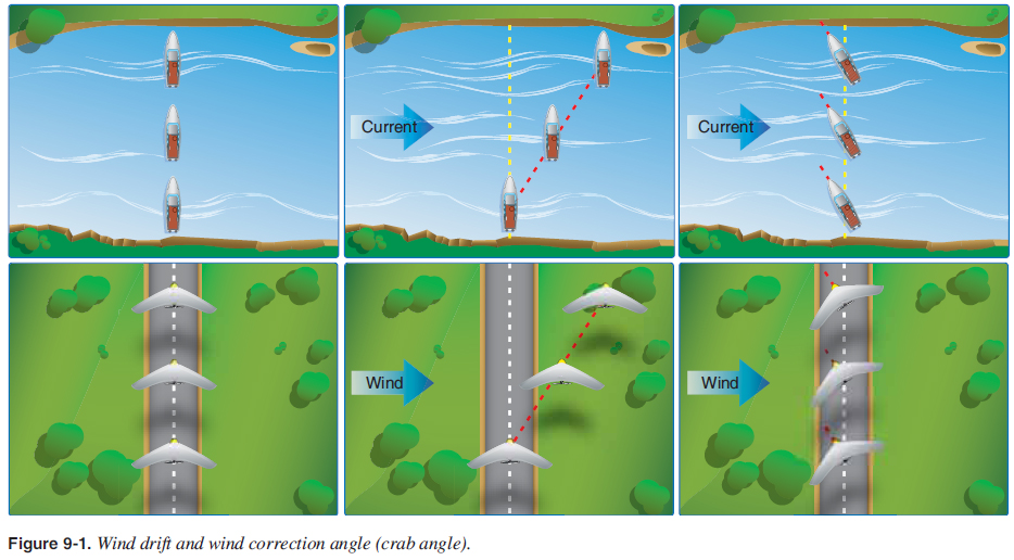 During these maneuvers, both the instructor and the student should be alert for available forced-landing fi elds. The area chosen should be away from communities, livestock, or groups of people to prevent becoming an annoyance or hazard. Due to the altitudes at which these maneuvers are performed, there is little time available to search for a suitable fi eld for landing in the event the need arises. Drift and Ground Track Control Whenever an object is free from the ground, it is affected by the medium surrounding it. This means that a free object moves in whatever direction and speed that the medium moves. For example, if a powerboat were crossing a still river, the boat could head directly to a point on the opposite shore and travel on a straight course to that point without drifting. However, if the river were fl owing swiftly, the water current would require consideration. That is, as the boat progresses forward on its own power, it must also move upstream at the same rate the river is moving it downstream. This is accomplished by angling the boat upstream suffi ciently to counteract the downstream fl ow. If this is done, the boat follows the desired track across the river from the departure point directly to the intended destination point. If the boat is not headed suffi ciently upstream, it would drift with the current and run aground at some point downstream on the opposite bank. [Figure 9-1]