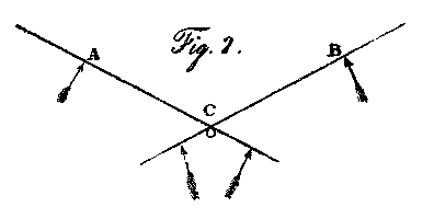 With regard to the second obstacle in the way of aerial navigation, viz. the length of leverage to which large winglike surfaces are exposed, it may be observed, that, being a constant and invariable quality, arising from the degree of support such surfaces give, estimated at their centres of resistance, it may be balanced by any elastic agent, that is so placed as to oppose it. Let A and B, Pl. IV, fig. 1, be two wings of an aerial vehicle in the act of skimming; then half the weight of the vessel is supported from the centre of resistance of each wing; as represented by the arrows under them. If the shorter ends of these levers be connected by cords to the string of a bow C, of sufficient power to balance the weight of the machine at the points A and B, then the moving power will be left at full liberty to produce the waft necessary to bend up the hinder edge of the wing, and gain the propelling power. A bow is not in fact an equable spring, but may be made so by using a spiral fusee. I have made use of it in this place merely as the most simple mode of stating the principle I wished to exhibit. Should a counterbalancing spring of this kind be adopted in the practice of aerial navigation, a small well polished cylinder, furnished with what may be termed a bag piston (upon the principle made use of by nature in preventing the return of the blood to the heart, when it has been driven into the aorta, by the intervention of the semilunar valves) would, by a vacuum being excited each stroke of the wing, produce the desired effect, with scarcely any loss by friction.1 These elastic agents may likewise be useful in gradually stopping the momentum of large surfaces when used in any alternate motion, and in thus restoring it during their return.
