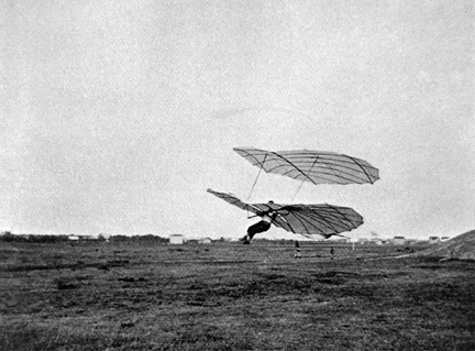The means by which I sought to facilitate the management of the machines and to increase their use in wind, consisted in the first place in different arrangements for changing the shape of the wings at will. I will, however, pass over the results here obtained as another principle gave surprisingly favorable results. My experiments in sailing flight have accustomed me to bring about the steering by simply changing the centre of gravity. The smaller the surface extension of the apparatus is, the better control I have over it, and yet if I employ smaller bearing surfaces in stronger winds, the results are not more favorable. The idea therefore occurred to me to apply two smaller surfaces, one above the other, which both have a lifting effect when sailing through the air. Thus the same result must follow which would be gained by a single surface of twice the bearing capacity, but on account of its small dimensions this apparatus obeys much better the changes of the centre of gravity.