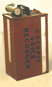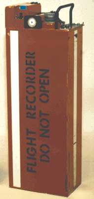 Time recorded ........ 25 hour continuous Number of parameters .............. 5 - 300+ Impact tolerance ....................... 3400Gs /6.5ms Fire resistance ........................... 1100 degC/30 min Water pressure resistance ......... submerged 20,000 ft Underwater locator beacon ...... 37.5 KHz Battery: 6yr shelf life 30 day operation Cockpit Voice Recorder