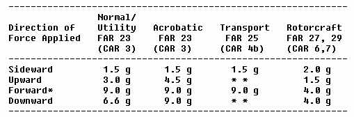 * When equipment mounting is located externally to one side, or forward of occupants, a forward load factor of 2.0 g is sufficient. ** Due to differences among various aircraft designs in flight and ground load factors, contact the aircraft manufacturer for the load factors required for a given model and location. In lieu of specific information, the factors used for FAR 23 utility category are acceptable for aircraft with never exceed speed of 250 knots or less and the factors used for FAR 23 acrobatic category for all other transport aircraft. The following is an example of determining the static test loads for