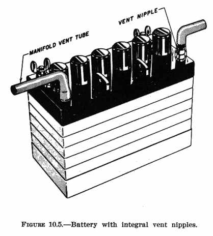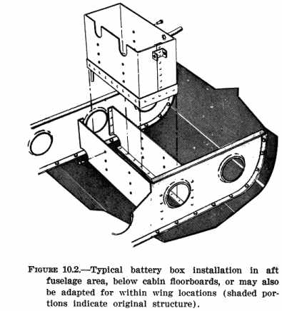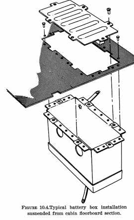 b. Protection from Engine Heat. The installation should protect the battery from extreme engine heat, which would be detrimental to the battery's service life and reliability. Such protection should provide for the temperatures encountered after engine shutdown as well as during engine operation. When locating the battery within the engine compartment, choose a location that will not interfere with the flow of engine cooling air. c. Protection from Mechanical Damage. Vibration and other shock loads are a major cause of short battery life. Whenever possible install the battery in a manner or location that will minimize damage from airframe vibration and prevent accidental damage by passengers or cargo. d. Passenger Protection. Enclose the battery in a box or other suitable structure to protect passengers from any fumes or electrolyte that may be spilled as a result of battery overheating, minor crash, inverted flight, and/or rapid decompression if the battery is located within the aircraft's pressure vessel. e. Airframe Protection. Protect the airframe structure and fluid lines by applying asphaltic or rubber-base paint to the areas adjacent to and below the battery or battery box. Apply paralketone, heavy grease, or other comparable protective coating to control cables in the vicinity of the battery or battery box. Damage to adjacent fabric covering and electrical equipment can be minimized by providing a battery sump jar containing a neutralizing agent, properly locating battery drains and vent discharge lines, and adequately venting the battery compartment. 178. DUPLICATION OF THE MANUFACTURER'S INSTALLATION. The availability of ready made parts and attachment fittings may make it desirable to consider the location and type of installation selected and designed by the airframe manufacturer. Appreciable savings in time and work may be realized if previously approved data and/or parts are used. 179. OTHER INSTALLATIONS. If the battery installation has not been previously approved, or if the battery is to be installed or relocated in a manner or location other than provided in previously approved data, perform static tests on the completed installation as outlined in chapter 1 of this handbook. Because of the concentrated mass of the battery, the support structure should also be rigid enough to prevent undue vibration which would lead to early structural failure. Typical illustrations of battery support structure are shown in figures 10.1 thru 10.4. {See Figure 10.2} {See Figure 10.3} 180. - 185. [RESERVED] Section 2. INSTALLATION 186. SECURING THE BATTERY. Install the battery box or hold-downs in such a manner as to hold the battery securely in place without subjecting it to excessive localized pressure which may distort or crack the battery case. Use rubber or wooden blocks protected with paraffin or asphaltic paint as spacers within the battery box, as necessary, to prevent shifting of the battery and possible shorting of the battery terminals or cables. Also, provide adequate clearance between the battery and any bolts and/or rivets which may protrude into the battery box or compartment. 187. VENTING. Provide suitable venting to the battery compartment to prevent the accumulation of the hydrogen gas evolved during operation. For most aircraft batteries, an airflow of 5 cubic feet per minute is sufficient to purge the battery compartment of explosive concentrations of hydrogen. a. Manifold Type. In this type of venting, one or more batteries are connected, via battery or battery box vent nipples, to a hose or tube manifold system as shown in figure 10.5. Fasten such hoses securely to prevent shifting and maintain adequate bend radii to prevent kinking. (1) The upstream side of the system is connected to a positive pressure point on the aircraft, and the downstream side is usually discharged overboard to a negative pressure area. It is advisable to install a battery sump jar in the downstream side to neutralize any corrosive vapors that may be discharged. (2) When selecting these pressure points, select points that will always provide the proper direction of airflow through the manifold system during all normal operating attitudes. Reversals of flow within the vent system should not be permitted when a battery sump jar is installed, as the neutralizing agent in the jar may contaminate the electrolyte within the battery. b. Free Airflow Type. Battery cases or boxes that contain louvers may be installed without an individual vent system, provided: (1) The compartment in which the battery is installed has sufficient airflow to prevent the accumulation of explosive mixtures of hydrogen; (2) Noxious fumes are directed away from occupants; and (3) Suitable precautions are taken to prevent corrosive battery fluids or vapors from damaging surrounding structure, covering, equipment, control cables, wiring, etc. 188. DRAINS. Position battery compartment drains so that they do not allow spillage to come in contact with the aircraft during either ground or flight attitudes. Route the drains so that they have a positive slope without traps. Drains should be at least 1/2" in diameter to prevent clogging. 189. ELECTRICAL INSTALLATION. a. Cables/Connectors. Use cables and/or connectors that are adequately rated for the current demand and are properly installed (See AC 43.13-1A, "Acceptable Methods, Techniques, and Practices - Aircraft Inspection and Repair," chapter 11). It may be necessary to contact the battery manufacturer to determine current value of the battery at the 5 minute discharge rate. Cable size can also be selected by using the same gauge as used on a previously approved production aircraft with the same battery. (1) The cables should be of sufficient length to prevent undue strain on the battery connector or terminals. (2) Clamp and protect cables, including the bus, in a very secure manner. Since these units are not fused, any fault could cause loss of the entire electrical system in a