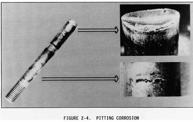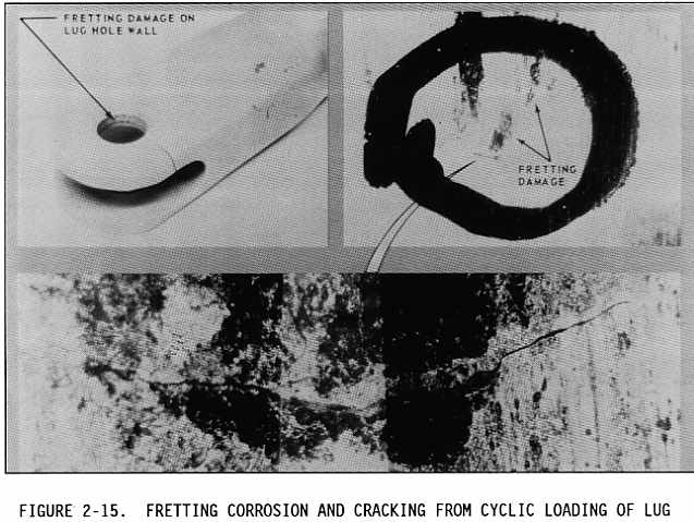 Damage can occur at the interface of two highly loaded surfaces which are not supposed to move against each other. However, vibration may cause the surfaces to rub together resulting in an abrasive wear known as fretting. The protective film on the metallic surfaces is removed by the rubbing action. The continued rubbing of the two surfaces prevents formation of protective oxide film and exposes fresh active metal to the atmosphere. Fretting can cause severe pitting (see Figure 2-15). Dampening of vibration, tightening of joints, application of a lubricant, or installation of a fretting resistant material between the two surfaces can reduce fretting corrosion.