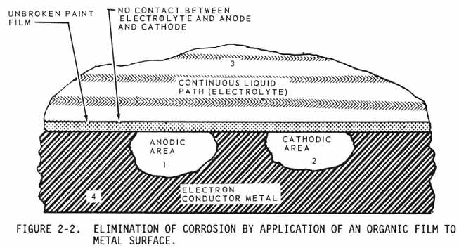 b. Elimination of any one of these conditions will stop corrosion. An example would be a paint film on the metal surface (see Figure 2-2). Some metals (such as stainless steel and titanium), under the right conditions, produce corrosion products that are so tightly bound to the corroding metal that they form an invisible oxide film (called a passive film), which prevents further corrosion. When the film of corrosion products is loose and porous (such as those of aluminum and magnesium), an electrolyte can easily penetrate and continue the corrosion process, producing more extensive damage than surface appearance would show.