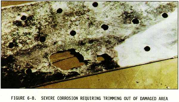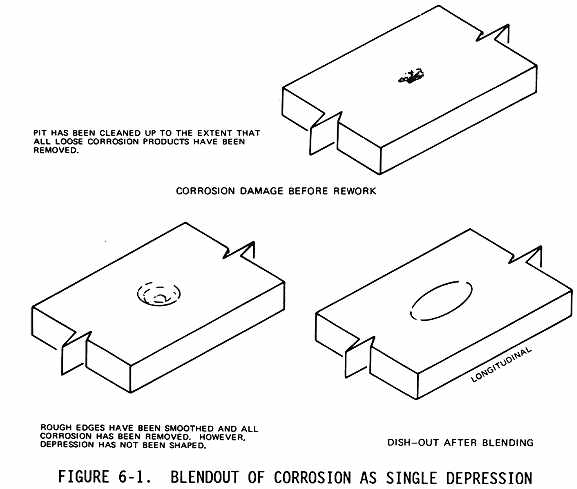 SECTION 4. CORROSION DAMAGE AND REWORK LIMITS 640. DISCUSSION. Corrosion evaluation will be required after general inspection and cleaning to determine the nature and extent of repair or rework. Local blending of corroded areas may be required to determine the total extent of the corrosion problem (see Figures 6-1, 6-2, 6-3 and 6-4). Corrosion damage classifications are defined as follows: a. Light corrosion. Characterized by discoloration or pitting to a depth of approximately 0.001 inch maximum. This type of damage is normally removed by light, hand sanding or a minimum of chemical treatment. b. Moderate corrosion. Appears similar to light corrosion except there may be some blisters or evidence of scaling and flaking. Pitting depths may be as deep as 0.010 inch. This type of damage is normally removed by extensive mechanical sanding. c. Severe corrosion. General appearance may be similar to moderate corrosion with severe blistering exfoliation and scaling or flaking. Pitting depths will be deeper than 0.010 inch. This type of damage is normally removed by extensive mechanical sanding or grinding. Severe corrosion damage beyond the limits of the aircraft structural repair manual will require FAA approved engineering authorization and may include the following typical corrosion repairs: trimming out of cracked and corroded areas (see Figure 6-8) or spot facing of fastener locations (see Figure 6-9). 641. REMOVAL OF CORROSION. There are two basic methods of corrosion removal, mechanical and chemical. The method used depends upon the type of structure, its location, the type and severity of corrosion, and the availability of maintenance equipment. Mechanical methods of corrosion removal are the most commonly used including: sanding, buffing, grinding, and section removal. Avoid the use of soft metal wire brushes (i.e., copper alloys) as residual traces of copper on cleaned metal will contribute to future corrosion. If brushes are used they should be stainless steel or nonmetallic. Mechanical methods of corrosion removal are used on all three levels of corrosion damage. Chemical methods of corrosion removal are limited to light corrosion and only in areas where the chemicals cannot migrate to other areas. 642. DETERMINING DEGREE OF CORROSION DAMAGE. Determine degree of corrosion damage (light, moderate, or severe) with a depth dial gauge, straight edge, or a molding compound. The depth of corrosion cannot be measured until all the corrosion is removed. Before measurements are made, visually determine if corrosion is in an area which has previously been reworked. If corrosion is in the recess of a faired or blended area, measure damage to include the material which has previously been removed. The following method outlines the process for taking measurements with the depth gauge. a. Remove loose corrosion products, if present. b. Position depth gauge as illustrated in Figure 6-10 and determine the measurement reading. NOTE: The base of the depth gauge should be flat against the undamaged surface on each side of the corrosion. When taking measurements on concave or convex surfaces, place the base perpendicular to the radius of the surface as shown in Figure 6-10. c. Take several additional depth readings. d. Select deepest reading as being the depth of the corrosion damage. 643. DETERMINING REWORK LIMITS. The maximum allowable amount of material removed from any damaged surface may be determined from criteria contained in the allowable damage limit chart in the manufacturer's repair manual. If no criteria is given, contact the aircraft manufacturer for cleanup limits. 644. DETERMINING MATERIAL THICKNESS REDUCTION AFTER CORROSION CLEANUP. The amount of material which may be removed from a part or panel during corrosion cleanup is usually available in the manufacturer's allowable damage limit charts. To ensure that the allowable limits are not exceeded, an accurate measurement should be made of the material removed or material thickness remaining in the reworked area. a. Measurement of panel thickness after rework can be made using an ultrasonic tester. This method requires a qualified NDI operator and suitable test standards for calibration. b. Measurement of the depth of blended pits (material removed) can be made using a depth dial gauge (see Figure 6-10). If the depth dial gauge will not work, clay impressions, liquid rubber, or other similar means which will give accurate results may be used to determine material removed. In the event that material removal limits have been exceeded, the area or part should be repaired or replaced. If replacement or repair criteria is not contained in the repair manual, contact the manufacturer or the FAA. 645 - 649 RESERVED.
