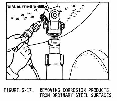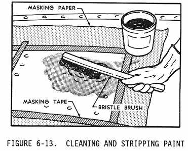 d. Protect the pitot static ports, louvers, airscoops, engine opening, wheels, tires, magnesium skin panels, and airplane interior from moisture and chemical brightening agents. e. Protect the surfaces adjacent to rework areas from chemical paint strippers, corrosion removal agents, and surface treatment materials. 613. PAINT REMOVAL. a. For small areas of metallic surfaces, paint may be removed by hand, using a medium grade abrasive mat. For larger areas, chemical paint removal is the preferred method. b. Phenolic and nonphenolic chemical paint removers containing methylene chloride are recommended for paint striping on metallic surfaces only. Chemical paint strippers containing acid should not be used as hydrogen embrittlement on high strength steel and some stainless steels will occur. The following procedure is recommended when using chemical paint remover: (1) Mask acrylic windows and canopies, other plastic parts, rubber hoses, exposed wiring, composite surfaces, wheels and tires, and any other areas where the paint remover residue cannot be removed and refinishing cannot be accomplished; (2) Remove sealants when required, by cutting away excess sealant with a sharp plastic scraper; (3) Apply a thick, continuous coating of paint remover to cover the surface to be stripped; (4) Allow paint remover to remain on the surface for a sufficient length of time to wrinkle and completely lift the paint. Reapply paint remover as necessary in the areas where paint remains tight or where the material has dried. Micarta scrapers, abrasive pads, or fiber brushes may be used to assist in removing persistent paint; (5) Remove loosened paint and residual paint remover by washing and scrubbing the surface with fresh water and a stiff nylon bristle brush or an abrasive pad; and (6) After thorough rinsing, remove masking materials and thoroughly clean the area with a solution of aircraft cleaning compound to remove paint remover residues. c. For composite surfaces, paint removal should be done by mechanical removal techniques (scuff sanding) only. Composite surfaces include fiberglass, kevlar, carbon, graphite, and others. Due to the irregularities in composite surfaces (fiber weave), complete removal of the paint system can not be accomplished without surface fiber damage. d. Mechanical paint removal may be done by hand or with fine or very fine abrasive mats or flap brushes on power tools. If power tools are used, care must be used to prevent removal of the base material. 614. SPECIAL TECHNIQUES. In special instances, a particular or specific method may be required to remove corrosion. Depending upon rework criteria, corrosion in a hole may be removed by enlarging the hole. Abrasive blasting may be required for removing corrosion from steel fasteners, side skins, or irregularly shaped parts or surfaces. Whenever such special cases occur, the specified method for corrosion removal should be observed. 615. FAIRING OR BLENDING REWORKED AREAS. All depressions resulting from corrosion rework should be faired or blended with the surrounding surface. Fairing can be accomplished as follows: a. Remove rough edges and all corrosion from the damaged area. All dish outs should be elliptically shaped with the major axis running spanwise on wings and horizontal stabilizers, longitudinally on fuselages, and vertically on vertical stabilizers. (SELECT THE PROPER ABRASIVE FOR FAIRING OPERATIONS FROM TABLE 6-1.) TABLE 6-1. ABRASIVES FOR CORROSION REMOVAL