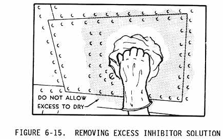 Treat as follows: (i) If splashed into eyes, quickly wipe eyelids with a soft cleaning tissue and immediately flush eye with gentle stream from a drinking fountain, cup, or other convenient water outlet while holding lids open. Call an ambulance and continue the flushing procedure until an ambulance arrives. (ii) If splashed onto an easily accessible part of body, immediately drench affected area with water until ambulance arrives. (iii) If splashed onto clothing or large area of body, immediately drench body and remove clothing while drenching until ambulance arrives. (iv) If taken internally, begin following treatment immediately: (A) If the person is conscious, cause vomiting by placing finger in back of the person's throat. Encourage the person to drink large quantities of water and repeatedly wash out the mouth. (B) If the person is unconscious, do not give any liquid. Start artificial respiration at once. Continue until ambulance arrives. If person regains consciousness before ambulance arrives, proceed as in subparagraph (A). 601. GENERAL CORROSION CONTROL WORK PROCEDURES. The effectiveness of corrosion control depends on how well basic work procedures are followed. The following common work practices are recommended: a. If rework procedures or materials are unknown, contact the aircraft manufacturer or authorized representative before proceeding; b. The work areas, equipment, and components should be clean and free of chips, grit, dirt, and foreign materials. c. Do not mark on any metal surface with a graphite pencil or any type of sharp, pointed instrument. Temporary markings (defined as markings soluble in water or methyl chloroform) should be used for metal layout work or marking on the aircraft to indicate corroded areas. d. Graphite should not be used as a lubricant for any component. Graphite is cathodic to all structural metals and will generate galvanic corrosion in the presence of moisture, especially if the graphite is applied in dry form. e. Footwear and clothing should be inspected for metal chips, slivers, rivet cuttings, dirt, sand, etc., and all such material removed before walking or working on metal surfaces such as wings, stabilizers, fuel tanks, etc. f. Do not abrade or scratch any surface unless it is an authorized procedure. If surfaces are accidentally scratched, the damage should be assessed and action taken to remove the scratch and treat the area. g. Coated metal surfaces should not be polished for aesthetic purposes. Buffing would remove the protective coating and a brightly polished surface is normally not as corrosion resistant as a nonpolished surface unless it is protected by wax, paint, etc. A bare skin sheet polished to a mirror finish is more resistant than a bare mill finished sheet when both are given regular maintenance. h. Protect surrounding areas when welding, grinding, drilling, etc., to prevent contaminating them with residue from these operations. In those areas where protective covering cannot be used, action should be taken to remove the residue by cleaning. i. Severely corroded screws, bolts, and washers should be replaced. When a protective coating, such as a cadmium plating on bolts, screws, etc., is damaged, immediate action should be taken to apply an appropriate protective finish to prevent additional corrosion damage. 602 - 609 RESERVED. SECTION 2. CORROSION REMOVAL TECHNIQUES 610. GENERAL. When active corrosion is visually apparent, a positive inspection and rework program is necessary to prevent any further deterioration of the structure. The following methods of assessing corrosion damage and procedures for rework of corroded areas could be used during cleanup programs. In general, any rework would involve the cleaning and stripping of all finish from the corroded area, the removal of corrosion products, and restoration of surface protective film. a. Repair of corrosion damage includes removal of all corrosion and corrosion products. When the corrosion damage exceeds the damage limits set by the aircraft manufacturer in the structural repair manual, the affected part must be replaced or an FAA approved engineering authorization for continued service for that part must be obtained. b. For corrosion damage on large structural parts which is in excess of that allowed in the structural repair manual and where replacement is not practical, contact the aircraft manufacturer for rework limits and procedures. 611. STANDARD METHODS. Several standard methods are available for corrosion removal. The methods normally used to remove corrosion are mechanical and chemical. Mechanical methods include hand sanding using abrasive mat, abrasive paper, or metal wool, and powered mechanical sanding, grinding, and buffing, using abrasive mat, grinding wheels, sanding discs, and abrasive rubber mats. However, the method used depends upon the metal and the degree of corrosion. The removal method to use on each metal for each particular degree of corrosion is outlined in the following paragraphs. 612. PREPARATIONS FOR REWORK. All corrosion products should be removed completely when corroded structures are reworked as the corroding process will continue even though the affected surface is refinished. Before starting rework of corroded areas, carry out the following: a. Position airplane in wash rack or provide washing apparatus for rapid