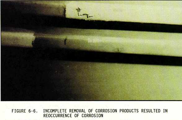 SECTION 5. ALUMINUM AND ALUMINUM ALLOYS 650. TREATMENT. In general, corrosion of aluminum can be more effectively treated in place rather than removing structural parts from the aircraft for corrosion treatment. Treatment includes the mechanical removal of the corrosion products, the inhibition of residual materials by chemical means, and the restoration of permanent surface coating. Details of treatment vary depending on whether the aluminum surfaces are to be left bare in use or are to be protected by paint coatings. 651. PROCESSING OF ALUMINUM SURFACES. a. Bare aluminum surfaces. While few unpainted aircraft are used under marine conditions, some general information is included on the nature of alclad surfaces and their treatment. Relatively speaking, pure aluminum has greater corrosion resistance than the stronger aluminum alloys. Advantage is taken of this by laminating a thin sheet of relatively pure aluminum, one to five mils thick, over the base higher strength aluminum alloy surface. The protection obtained is good, and the alclad surface can be maintained in a polished condition (see Figure 6-12). In cleaning such surfaces, however, care should be taken to prevent staining and marring of the exposed aluminum, and more important from a protection standpoint, to avoid unnecessary mechanical removal of the protective alclad layer and the exposure of more susceptible, but stronger, aluminum alloy base material. b. Additional processing of aluminum surfaces prior to paint finishes. Aluminum surfaces that are to be subsequently painted can be exposed to more severe cleaning procedures and can also be given more thorough corrective treatment prior to painting. Application of a paint finish requires proper prepaint treatment for good paint adhesion. c. Special treatment of anodized surfaces. Anodizing is the most common surface treatment of aluminum alloy surfaces. Tank processing is accomplished during manufacture or rework of a part or component and frequently prior to its fabrication from sheet stock. The aluminum sheet or casting is made as a positive pole in an electrolytic bath in which chromic acid or other oxidizing agents produce a supplemental protective oxide film on the aluminum surface. Aluminum oxide is naturally protective and anodizing merely increases the thickness and density of the natural oxide film. When this coating is damaged in service, it can only be partially restored by chemical surface treatment. Therefore, any processing of anodized surfaces should avoid unnecessary destruction of the oxide film. (1) Steel wool, steel wire brushes, copper alloy brushes, or severe abrasive materials should not be used on any aluminum surface. Aluminum wool, fiber bristle brushes, and mild abrasives are acceptable tools for cleaning anodized surfaces, but care should be exercised in any cleaning process to avoid unnecessary breaking of the protective film, particularly at the edges of the aluminum sheet (see Figures 6-11 and 6-13). (2) Tampico fiber brushes are preferred and are adequate to remove most corrosion. Producing a buffed or wire brush finish by any means should be prohibited. Take every precaution to maintain as much of the protective coating as practicable. Otherwise, treat anodized surfaces in the same manner as other aluminum finishes. Vacuum blasting is an acceptable corrosion removal method to remove surface corrosion. Vacuum blasting should not be used to remove intergranular corrosion. (3) Chemical conversion coating (Specification MIL-C-81706) is a chemical surface treatment used on aluminum alloys to inhibit corrosion and to provide a proper surface for paint finishing. d. Special processing of intergranular corrosion in heat treated aluminum alloy surfaces. Intergranular corrosion is usually more severe in heat treated aluminum alloys and is a corrosive attack along grain boundaries of the alloyed aluminum, where the grain boundaries differ from the metal within the grain. When in contact with an electrolyte, rapid corrosion occurs at the grain boundaries. In its most severe form, actual lifting of metal layers (exfoliation) occurs. The mechanical removal of all corrosion products and visible delaminated metal layers should be accomplished in order to determine the extent of the damage and to evaluate the remaining structural strength of the component. (1) Use metal scrapers, rotary files, or abrasive wheels to assure that all corrosion products are removed and that only structurally sound aluminum remains. NOTE: THE USE OF A ROTARY FILE IS RECOMMENDED ONLY FOR SEVERE INTERGRANULAR OR EXFOLIATION CORROSION REMOVAL. (2) Rotary files should be sharp to insure that they cut the metal without excessive smearing. A dull cutting tool will smear the metal over corrosion cracks or fissure and give the appearance that corrosion has been removed, when, in fact, it may not have been. (3) Carbide tip rotary files or metal scrapers should be utilized since they stay sharp longer. Abrasive blasting should not be used to remove intergranular corrosion. (4) Inspection with a 5 to 10 power magnifying glass or the use of dye penetrant will assist in determining if all unsound metal and corrosion products have been removed. (5) When complete removal of corrosion has been accomplished, blend or fair using a ratio of 20:1 (length to depth) in the area of corrosion removal. Blending, where required, can best be accomplished by using aluminum oxide impregnated, rubber base wheels. (6) Chemical conversion coat the exposed surfaces completely and restore paint coatings in the same manner as on any other aluminum surface (see Figures 6-14, 6-15, and 6-16). (7) Corrosion damage beyond the limits set in the structural repair manual should be repaired per a cognizant engineer or aircraft manufacturer's instructions that are FAA approved. 652. REPAIR OF ALUMINUM ALLOY SHEET METAL. After extensive corrosion removal, the following procedures should be followed: a. If water can be trappe