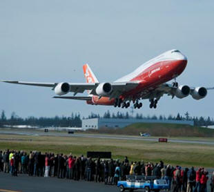 followed a route over "This a great day for the 747-8 team and for all of Boeing. What an honor it is to see such a beautiful airplane fly," said Elizabeth Lund, vice president and general manager of the 747-8 program. "I want to thank everybody who had a hand in designing, building and preparing this airplane for flight ? our engineers, our manufacturing employees, our colleagues in Boeing Fabrication, our colleagues in Boeing Test & Evaluation, our external suppliers ? for all their hard work." The 747-8 Intercontinental will have the lowest seat-mile cost of any large commercial jetliner, with 12 percent lower costs than its predecessor, the 747-400. The airplane provides 16 percent better fuel economy, 16 percent less carbon emissions per passenger and generates a 30 percent smaller noise footprint than the 747-400. The 747-8 Intercontinental applies interior features from the 787 Dreamliner that includes a new curved, upswept architecture giving passengers a greater feeling of space and comfort, while adding more room for personal belongings. |